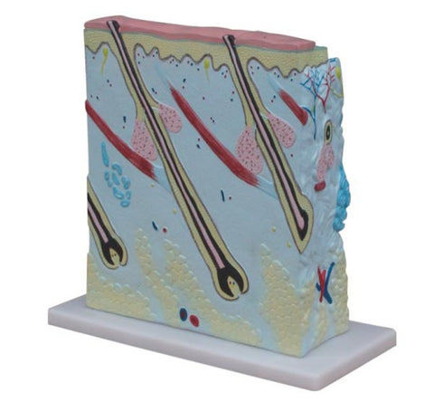 Una vista transversal muy ampliada (105 veces) de la piel humana que muestra tres capas y una vista de primer plano de un folículo piloso, una glándula sudorípara, tejido adiposo y más. Vista frontal, lateral y trasera. No diseccionable. El modelo muestra las estructuras del cuero cabelludo humano de la siguiente manera: 1. Estructura de la piel: epidermis, dermis, hipodermis. 2. Anexos de la piel: las glándulas sudoríparas, las glándulas sebáceas, los pelos. 3. Vasos sanguíneos y nervios de la piel. Montado sobre una base de plástico. Tamaño: 27x10x31CM.