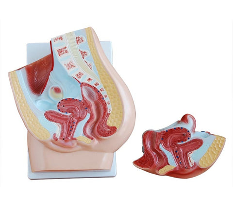 Este modelo de sección mediana muestra la posición normal de los órganos genitales femeninos con vejiga y recto en la pelvis femenina. Se muestran en detalle los músculos abdominales y de la pelvis. Fabricado en plástico PVC.