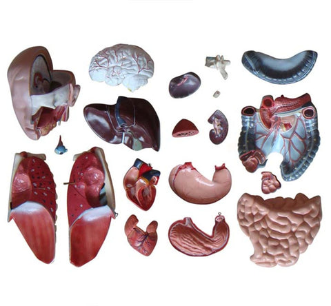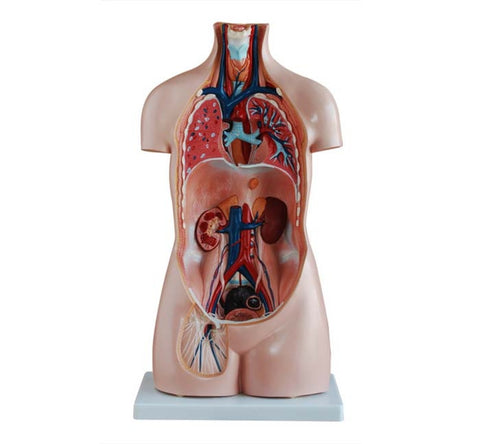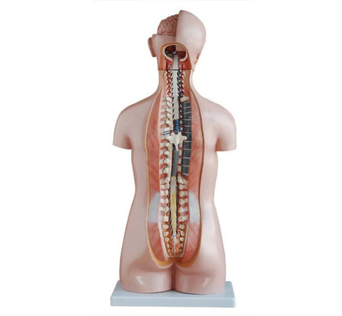 Ce modèle asexué comprend 20 parties dissécables : torse, tête, œil, cerveau, poumon avec attaches sternum et côtes (2 parties), cœur (2 parties), estomac (2 parties), foie, rate, rein, intestin (4 parties), vessie, vertèbres et nerfs spinaux (2 parties). Dos ouvert. Monté sur socle en plastique. Taille : 85CM.